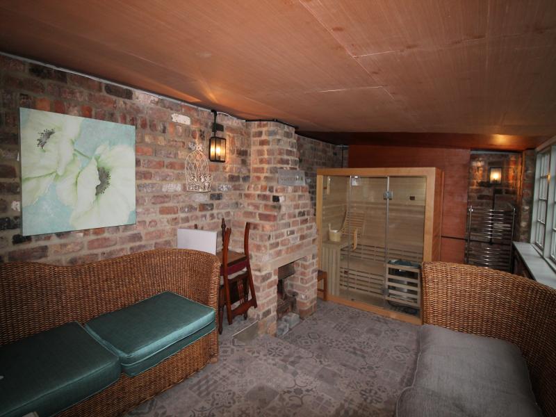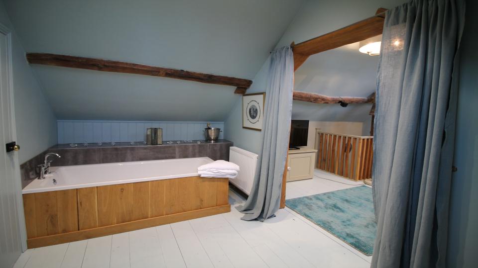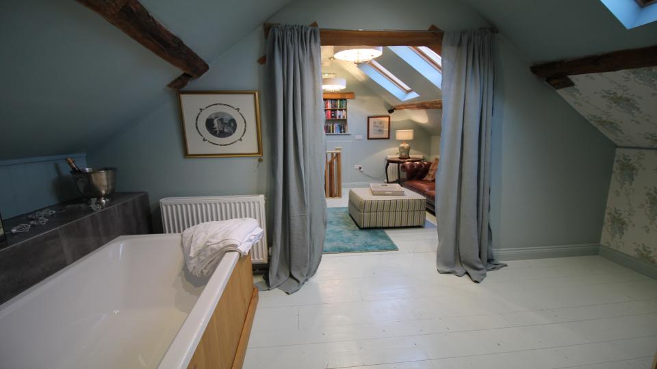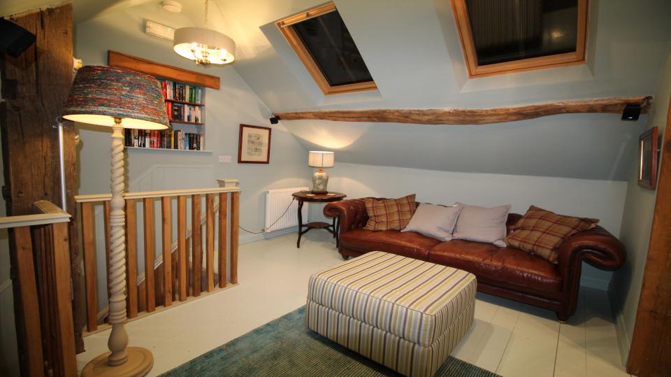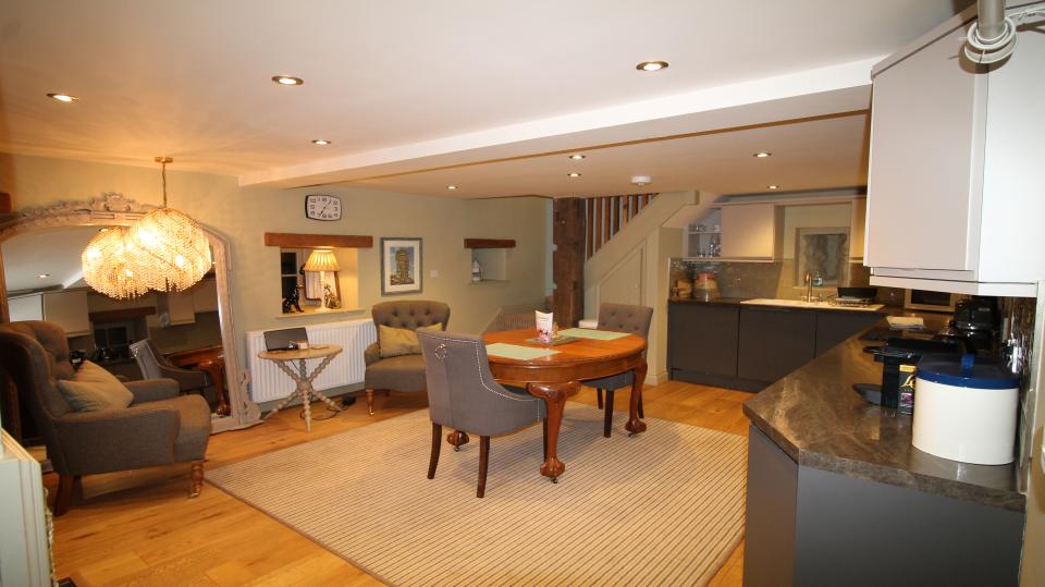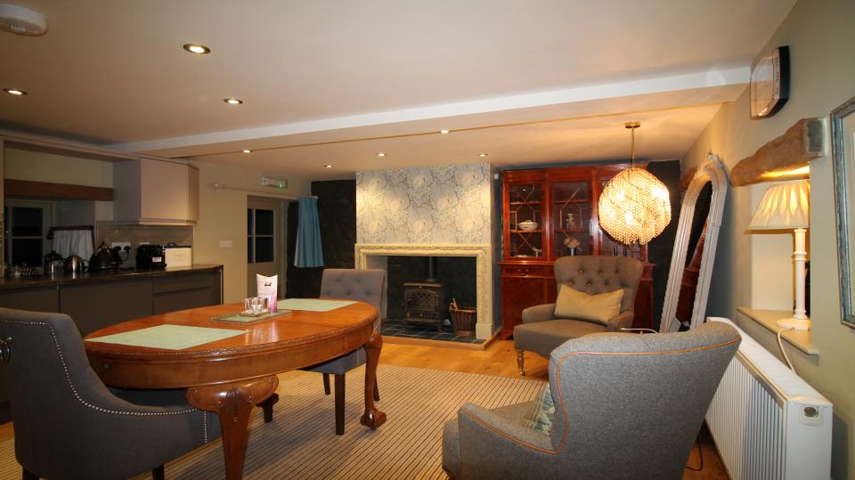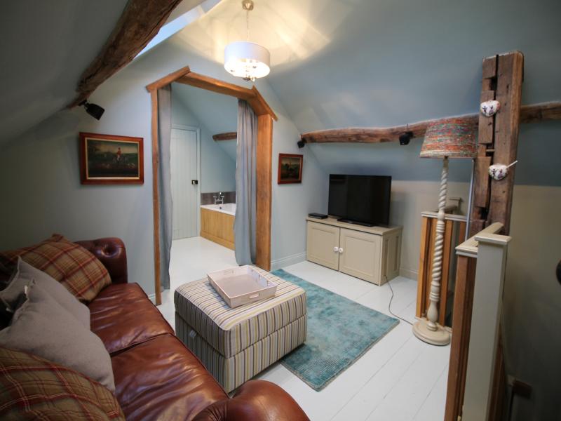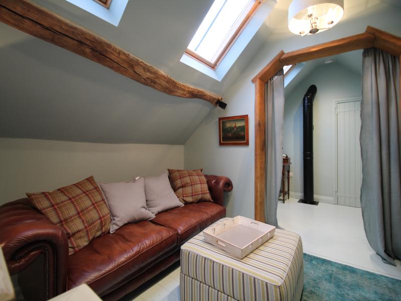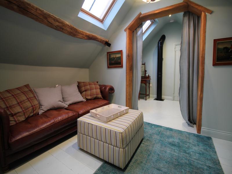 The Coach house is a luxurious and very characterful romantic cottage, which comprises of a large dining kitchen with beautiful contemporary units in lava and kashmir colours. This room is situated on the ground floor with period fireplace housing a log burner with two upholstered chairs in wool and leather,  a Victorian mahogany dining table with linen dining chairs. A staircase leads to a sitting room with pine floor and very soft comfy leather Chesterfield sofa. This room has a large flat screen TV with Bose surround sound.