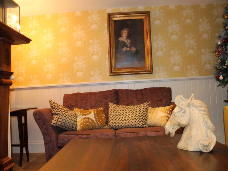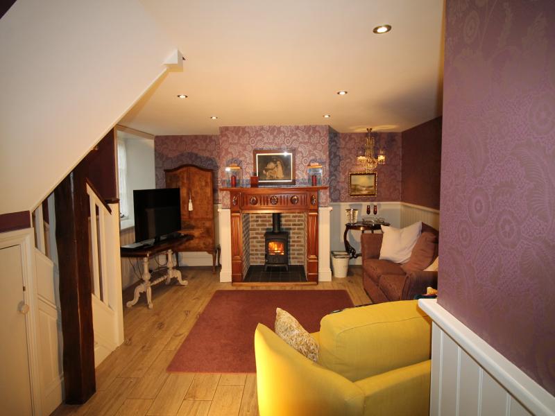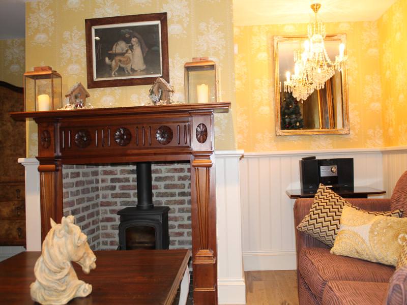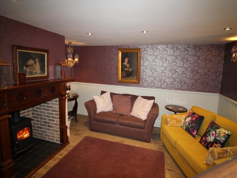 The bespoke kitchen is luxury, equipped to a high standard with a large dining table. This opens into a luxury sitting room with two comfy sofas around an antique fireplace housing a wood burning stove.